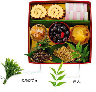 煮物などが多く茶色い印象の見た目になったり、地味に思えたときには、おせちによく使われる植物を活用しましょう。身近にないときには、年末シーズンはスーパーや生花店などでも手に入ります。使うまでは水にさして。