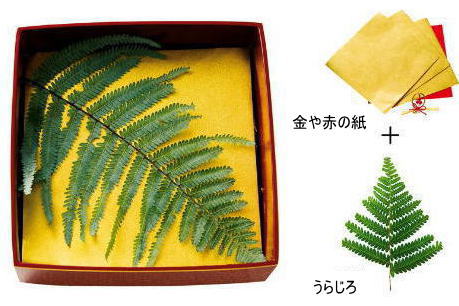 常緑のしだ。葉の袁が白いことから、正直な心をあらわすとされます。また2枚の葉が向かい合っているため、夫婦和合の意味も。白いほうを上にして使いましょう。