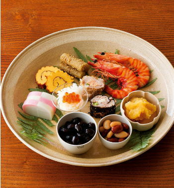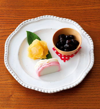 大きめの皿にうらじろなどを敷いて、おせち料理を盛ります。豆のように小さいものや、ほかの料理と味がまざるのを防ぎたい酢の物は、小さな器に入れて添えるのがコツです。たくさんの量をのせないほうがおしゃれな仕上がりに。余裕のある盛りつけにして、こまめに補充しましょう。