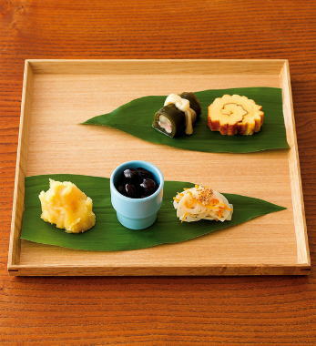 白木のトレイに葉らんを互い違いに2枚敷き、おせち料理を少しずつ間隔をあけて盛ります。来客のときなど、1人分ずつおしゃれに盛って出したいときにおすすめ。料理の色や味が偏らないように、バランスを考えながら盛り合わせましょう。