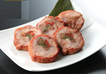 国産の鶏もも肉で、彩りの良い国産野菜(いんげん・にんじん・ごぼう)を巻いて、しっとりやわらかく仕上げました。
